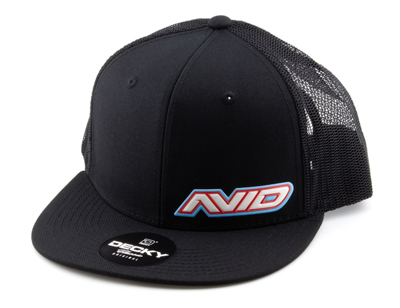 The Avid flat bill hat is black with an "AVID" domed patch in the colors red, white, and baby blue (RWBB) on one size fits all Decky Snapback cap.