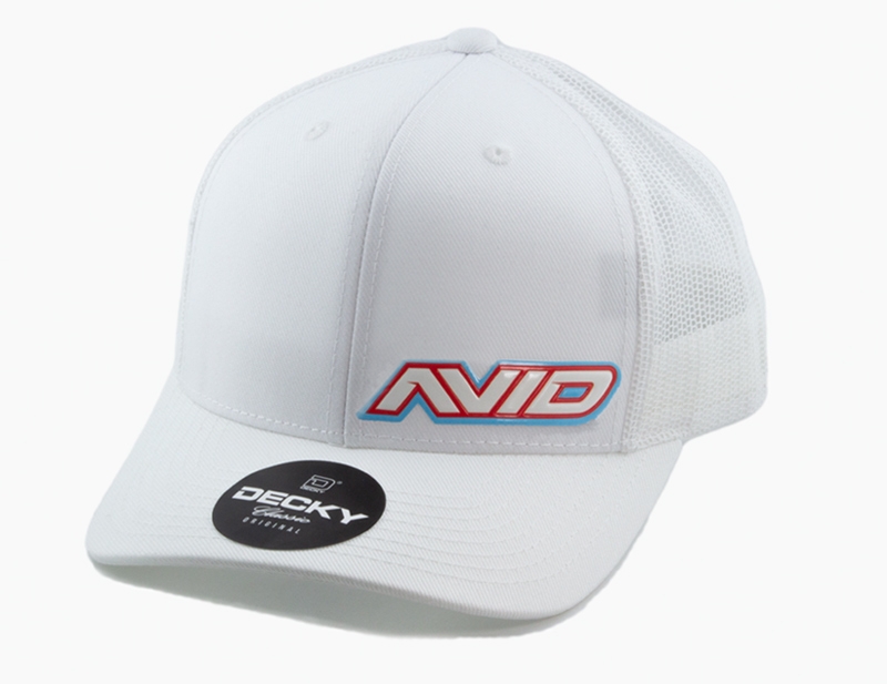 The Avid curved bill hat is white with an "AVID" domed patch in the colors red, white, and baby blue (RWBB) on one size fits all Decky Snapback cap.