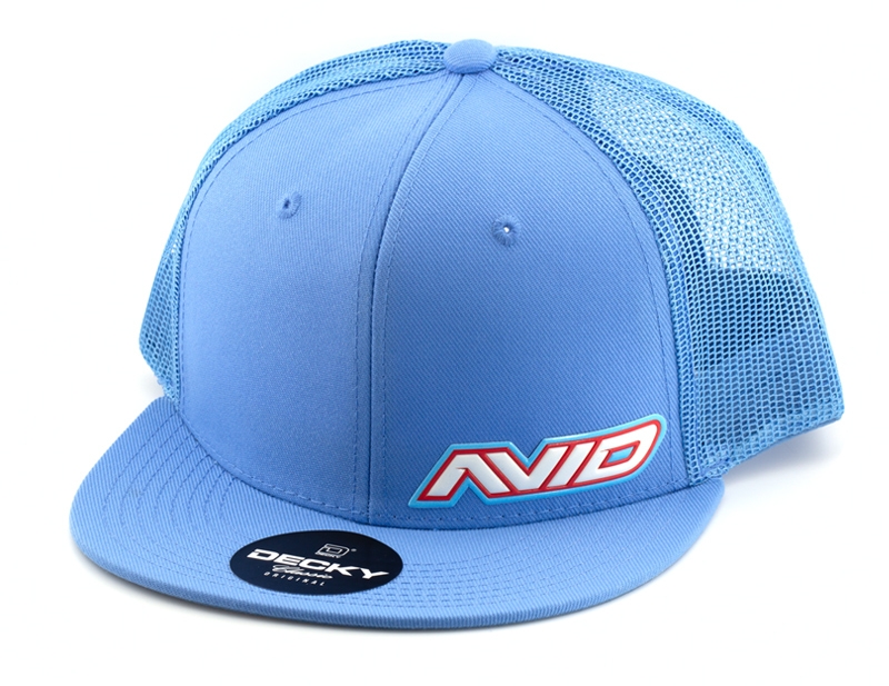 The Avid flat bill hat is black with an "AVID" domed patch in the colors red, white, and baby blue (RWBB) on one size fits all Decky Snapback cap.